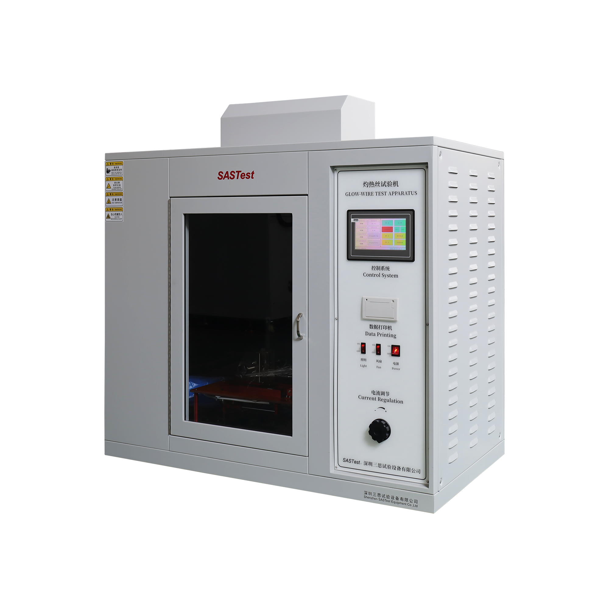 灼熱絲試驗箱控制系統(tǒng)自動化,啟動后裝夾試樣的小車會自動將試樣運行到灼熱絲處,到達設(shè)定的灼熱時間后會自動返回,內(nèi)部為黑色背景,帶有抽風(fēng)和照明裝置,時間、溫度數(shù)字顯示,方便觀察記錄。